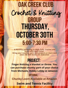 Oak Creek Club Crochet & Knitting Club Thursday, October 30th, 2025 @5:00 P.M.